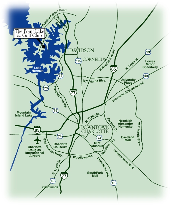 Directions: Follow I-77 to exit 33 (Lake Norman.) Go west on Williamson Road. Turn left on Brawley School Road and follow it approximately five miles to The Point. At the traffic circle, take your third right onto The Point Drive. Turn right on Queen Anne Circle, where you will see The Point Lake and Golf Club facilities. |
